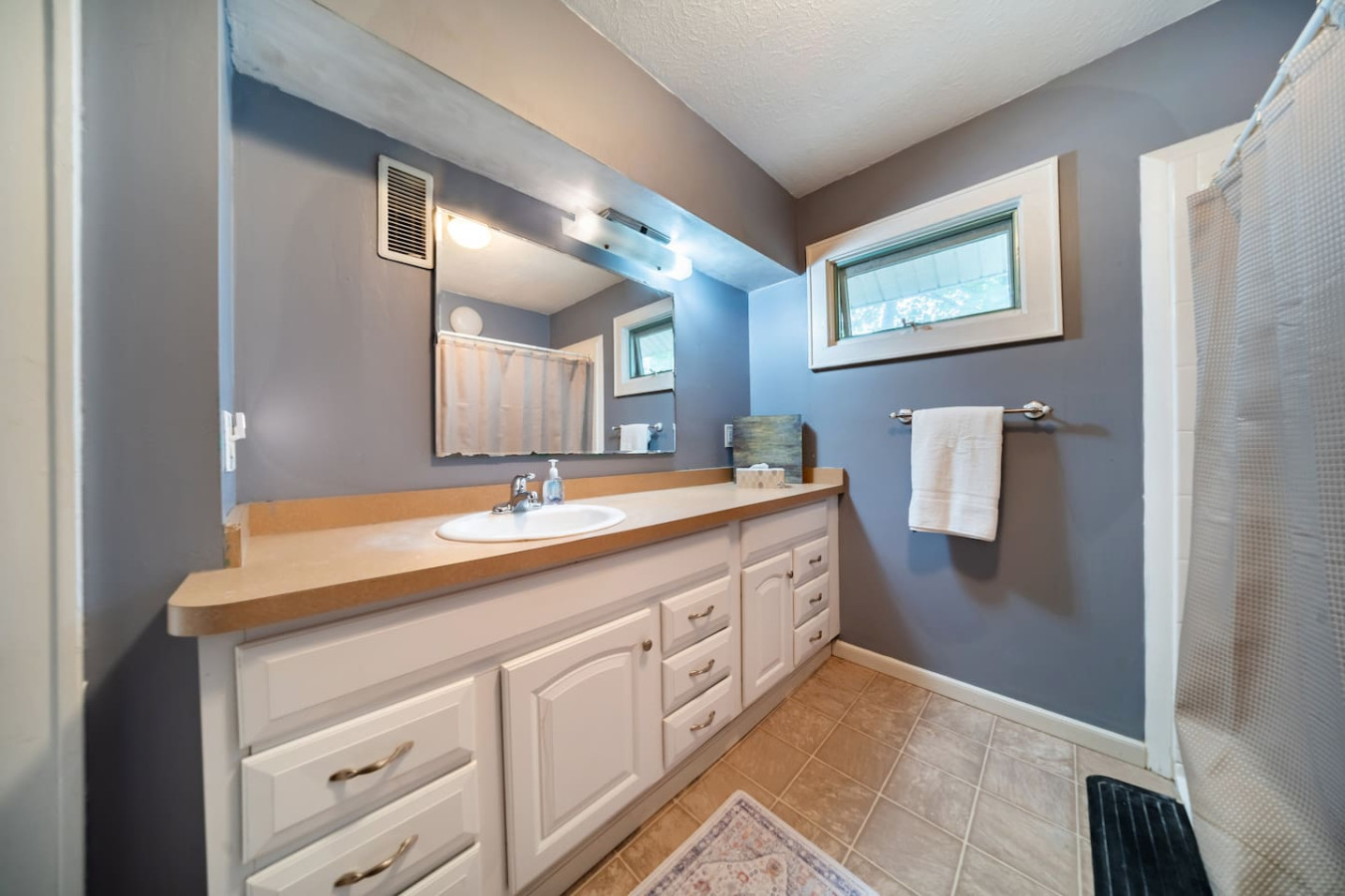 June 2025 3.00Not sure why other reviewers didn't mention the house literally backs up the freeway and is very noisy at night. House does not have central AC, but window units in 2 of 3 bedrooms and living room. There was a box fan in the bedroom with no ac, but it just moved the warm air around and we didn’t sleep well. The stairs to two of the bedrooms are very steep and narrow. Upstairs bathroom is very small: shower, pedestal sink, with nowhere to put a hairdryer or hairbrush. If you’re standing at the sink, just backup a few inches and you can sit on the toilet. The kitchen had dirty rags and dirty dishes in the cupboard, there was 1 real bowl, and about 4 salad plates, no dinner plates. and a couple of items to drink from. The house is old and tired. Upstairs bathroom needs to be painted… the window sills and wall paint are a a bit disgusting.