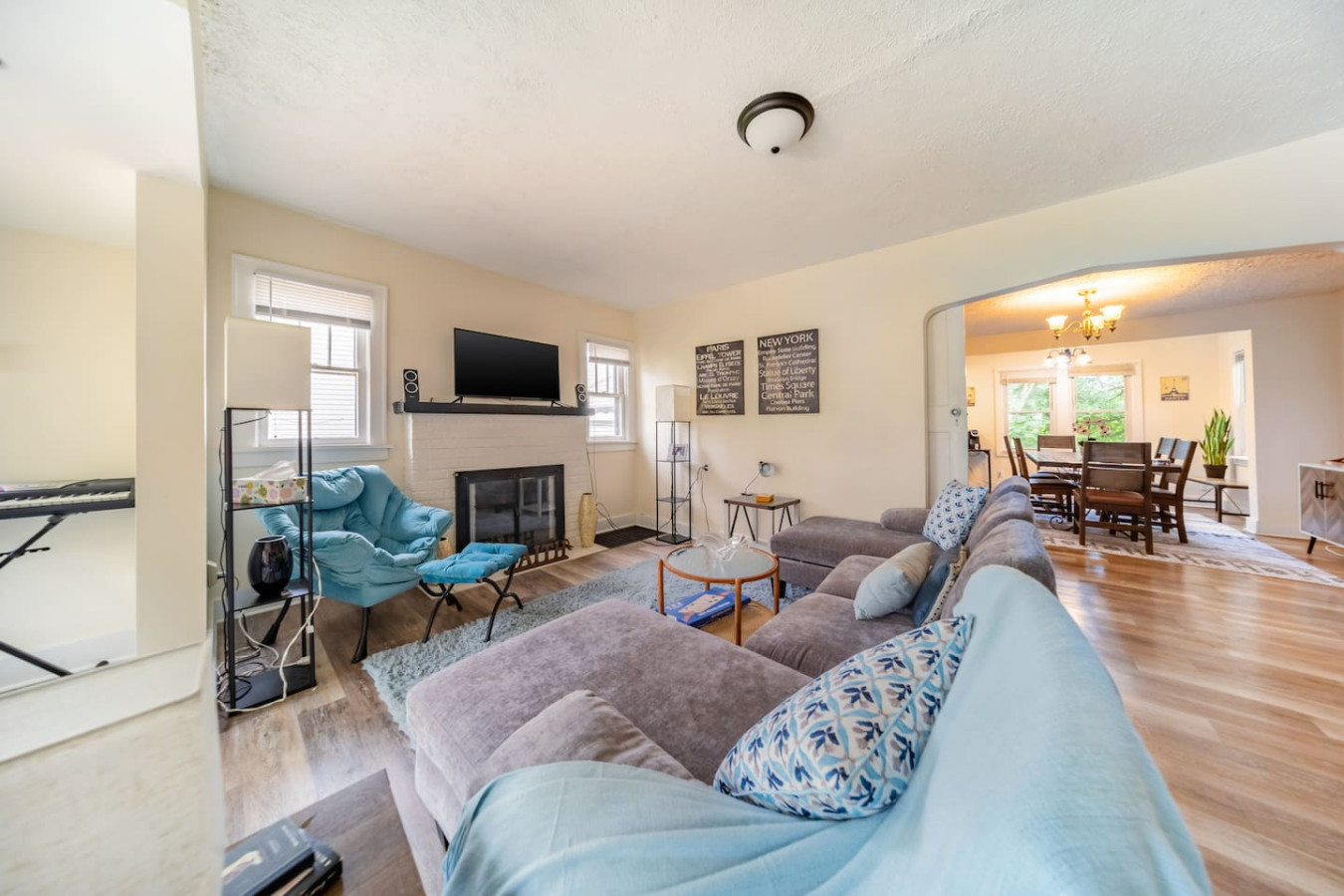 / nightMake some memories at this unique and family-This beautifully decorated home boasts spacious and comfortable living areas, cozy bedrooms, and a fully equipped kitchen for all your cooking needs. Relax in the backyard oasis, complete with a patio, and fire pit, perfect for warm summer nights. Need to get some work done? Take advantage of the high-speed Wi-Fi and designated workspace. 3 bedroom, 1 queen bedroom and full bath with walk in shower on first floor, 2 smaller bedrooms and another full bath on 2nd floor. Large dining table and fully equipped kitchen. Living room with smart tv and seating for 5. Don't miss out on the opportunity to make this cozy and inviting home your home away from home. Book now and experience all that Cuyahoga Falls has to offer!friendly place. Conveniently located near the Cuyahoga Valley National Park, you can explore the great outdoors with hiking trails, scenic train rides, and breathtaking waterfalls. Don't forget to check out Blossom Music Center for concerts and events, just a short drive away. For a night out, head to downtown Akron for a variety of entertainment options.