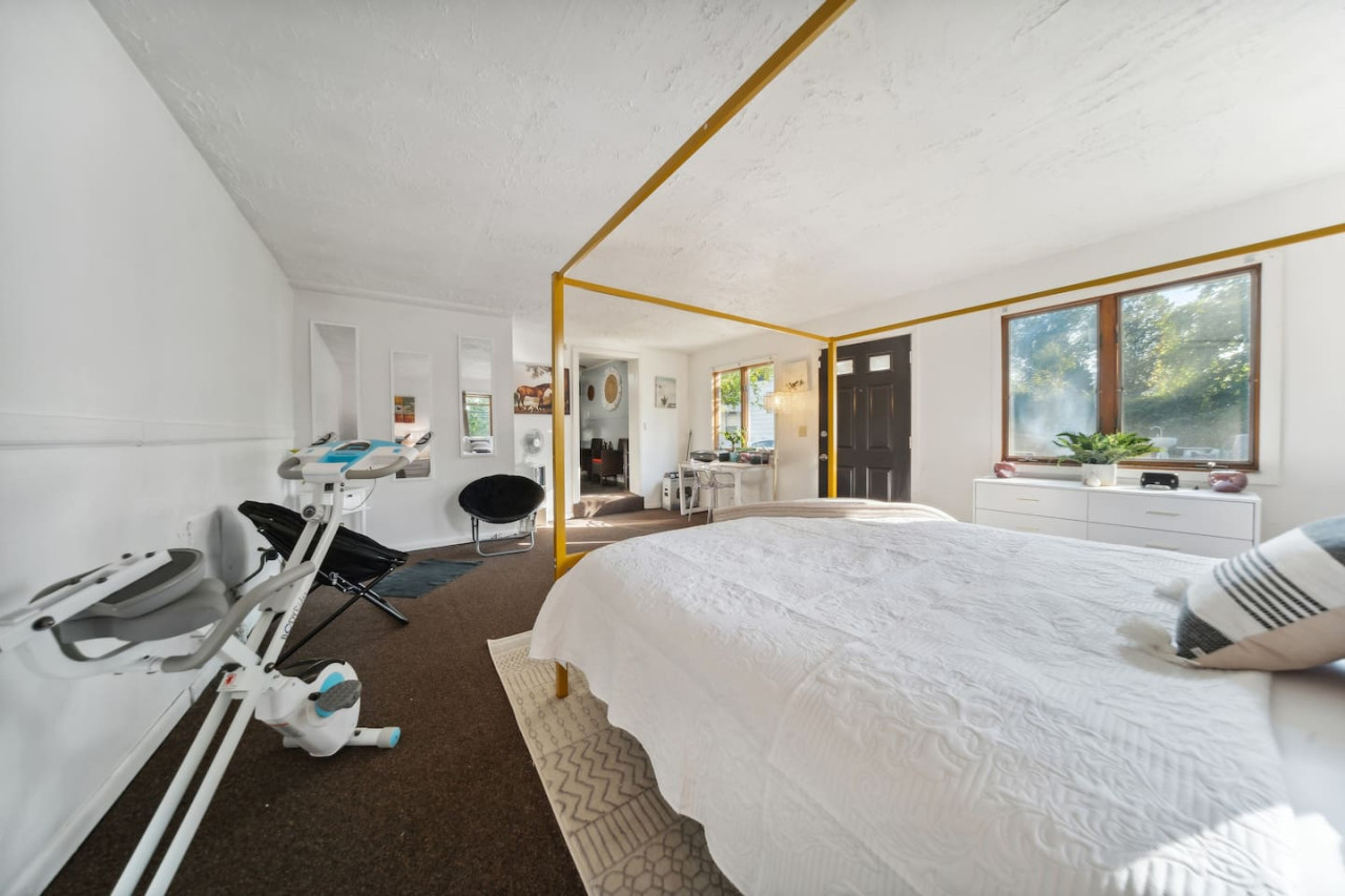 / nightWow. Coming to Cleveland for a show, a conference, or to take in the Rock & Roll Hall of Fame? This house is your perfect home-away-from-home, just 12 minutes from downtown. But it's so stocked with amenities and features, you may never leave the house! Check out the fully stocked kitchen with the stylish dining area. Make a full dinner or just enjoy your morning coffee. (Or head out to the patio for an outdoor brunch.) Sit in the living room on the comfy couches and take in a show on the smart TV. Steal away to one of the three bedrooms - one with a king bed, one queen, and the third with bunk beds for the kids. Get in your morning exercise with a spin on the stationery bike in the master bedroom. And the bathroom is fully stocked and lovely. Enjoy your stay with all the comforts of home just minutes from Cleveland. .